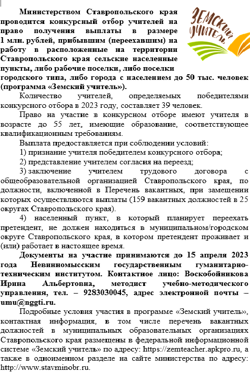 Подробные условия участия в программе «Земский учитель», в том числе перечень вакантных должностей в муниципальных образовательных организациях Ставропольского края будут размещены не позднее 10 января 2023 года в федеральной информационной системе «Земский учитель» по адресу: https://zemteacher.apkpro.ru, а также в одноименном разделе на сайте министерства по адресу: http://www.stavminobr.ru.