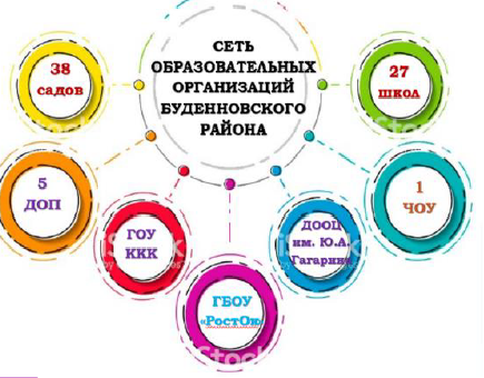 В январе 2012 года в системе образования Буденновского района появилось новое учреждение – «Центр развития и поддержки системы образования Буденновского района», созданное для финансово-хозяйственного и методического обеспечения деятельности отдела образования и образовательных учреждений дошкольного, общего и дополнительного образования. Образовательный комплекс Буденновского района представлен 72 муниципальными учреждениями различных типов: